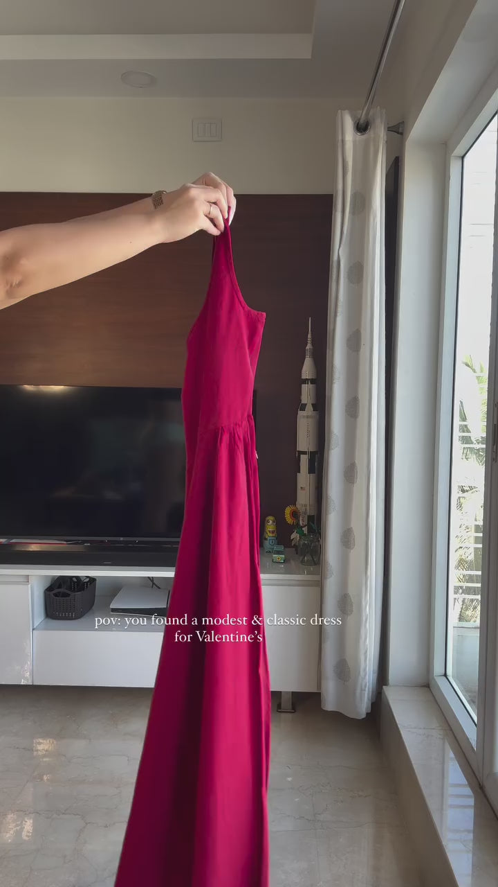 Chic, refined, and endlessly wearable - that's our Rouge Dress. Crafted from soft cotton-linen fabric blend, our Rouge Dress is a maroon maxi dress designed for ease and elegance. The side gathers create a flattering silhouette, while the sleeves keep it effortlessly breezy.